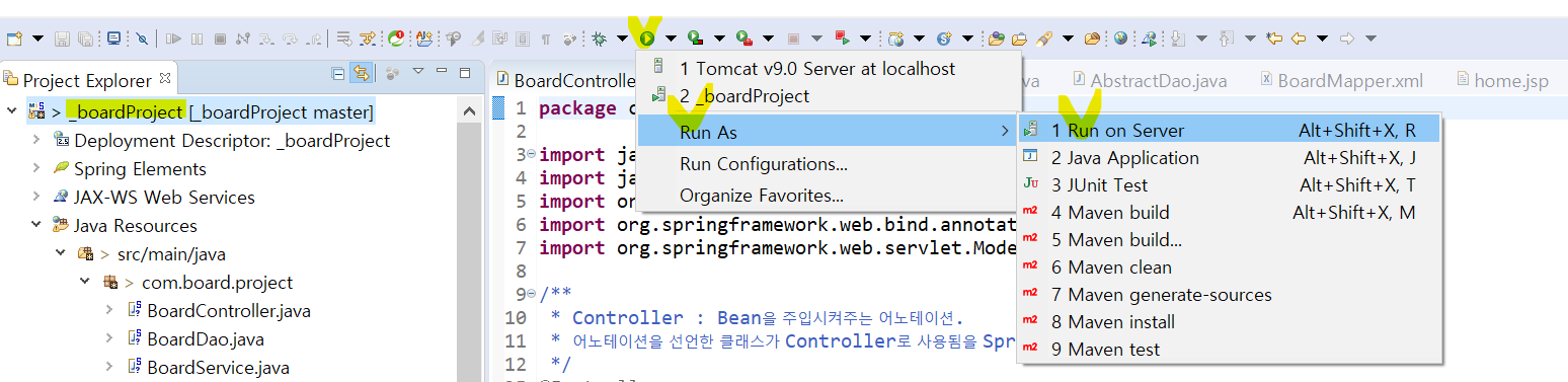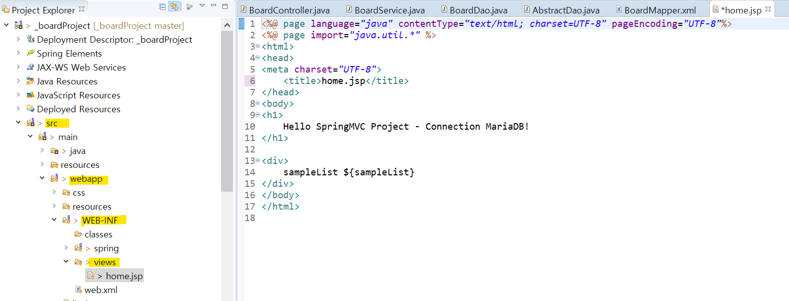 프로젝트의 Java Resources > src > com.board.project 패키지 아래에