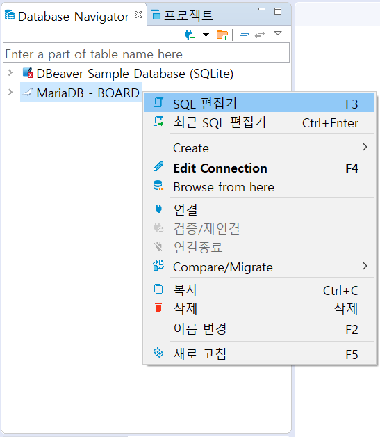 1) Database Navigator > MariaDB - BOARD DB 에서 마우스 우클릭 > SQL 편집기를 클릭
