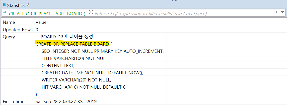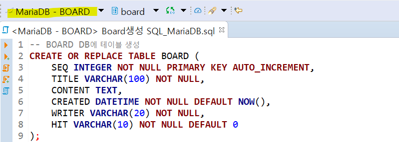 2) Active Datasource 가 생성한 BOARD DB 인지 확인 후 테이블 CREATE문 작성 후 실행