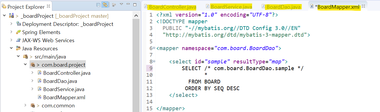 1) BoardMapper.xml 에 select 구문을 작성한다. id 는 변수 resultType은 리턴타입의 자료형을 입력한다.