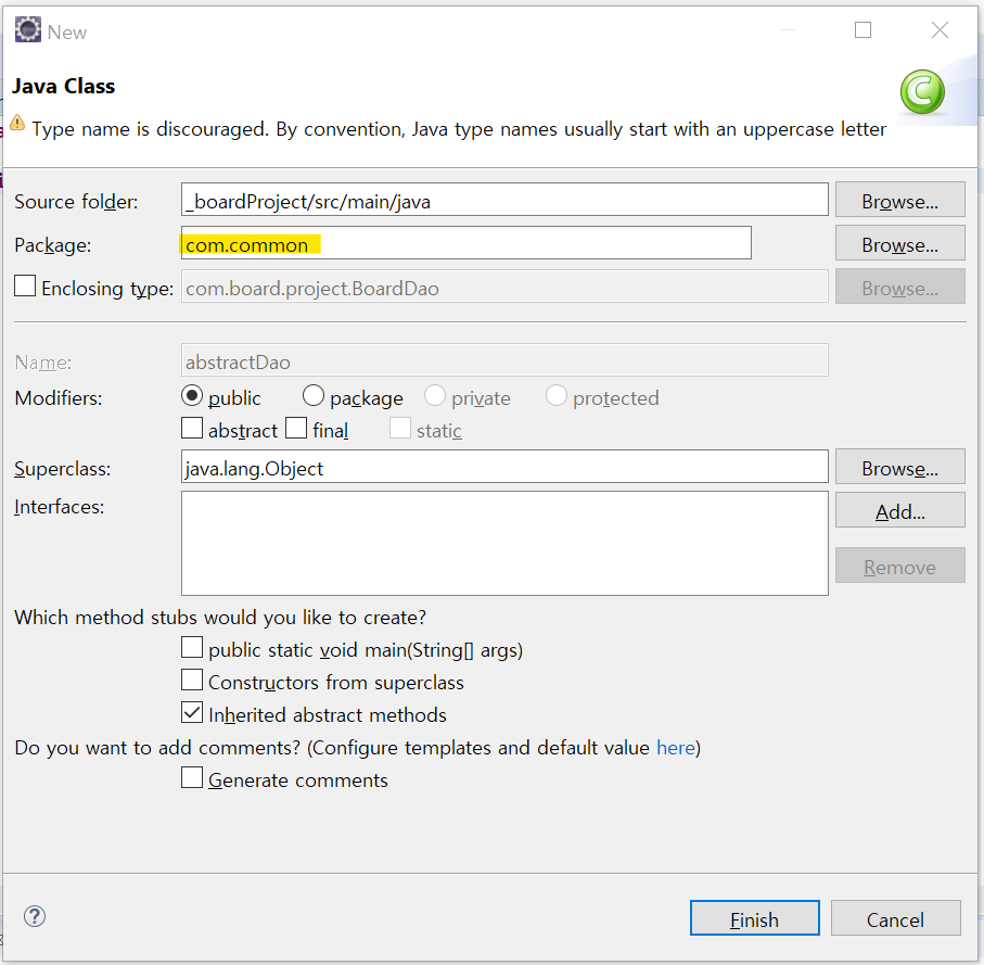 상속받을 클래스라서 패키지 이름은 com.common 으로 재설정해주었다.
