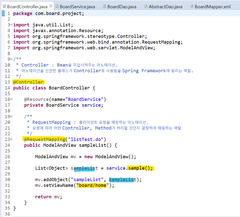 6) BoardController 클래스의 sampleList 메소드를 ModelAndView 으로 선언하여 service 와 연결한 뒤 mv 객체의 object와 viewName 을 지정해준다.