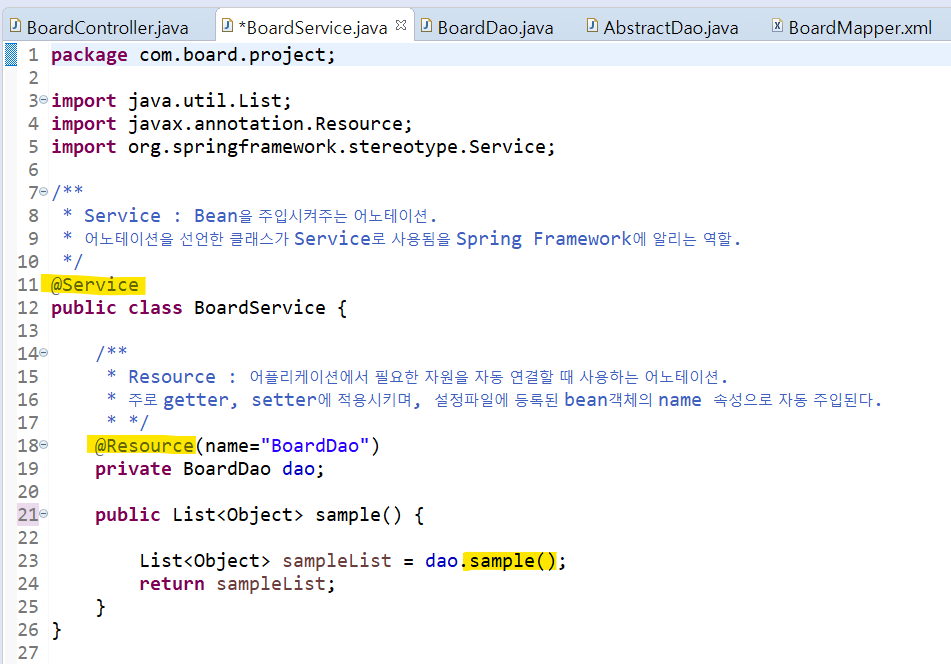 5) BoardService 클래스에 sample 메소드 아래 dao에서 넘겨받은 DB 조회값을 sampleList 에 담기