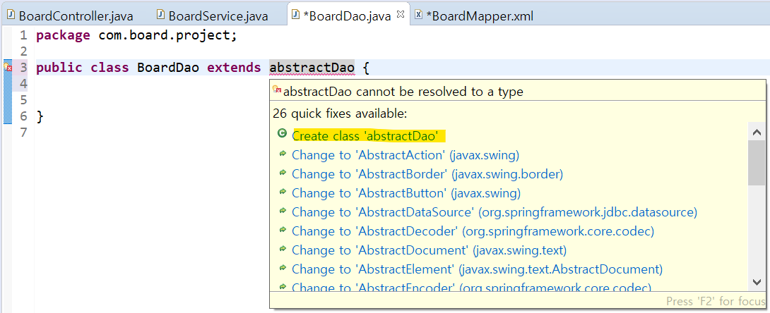 2) BoardDao 클래스명 옆에 AbstractDao 작성 후 빨간줄에 마우스를 가져가 대면 자동 import 구문이 나온다.