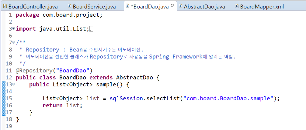 4) BoardDao 클래스 아래 sample 메소드 > sqlSession 템플릿 안에 selectList 로 mapper namespace 와 id 넘기기