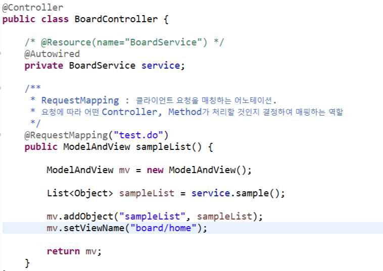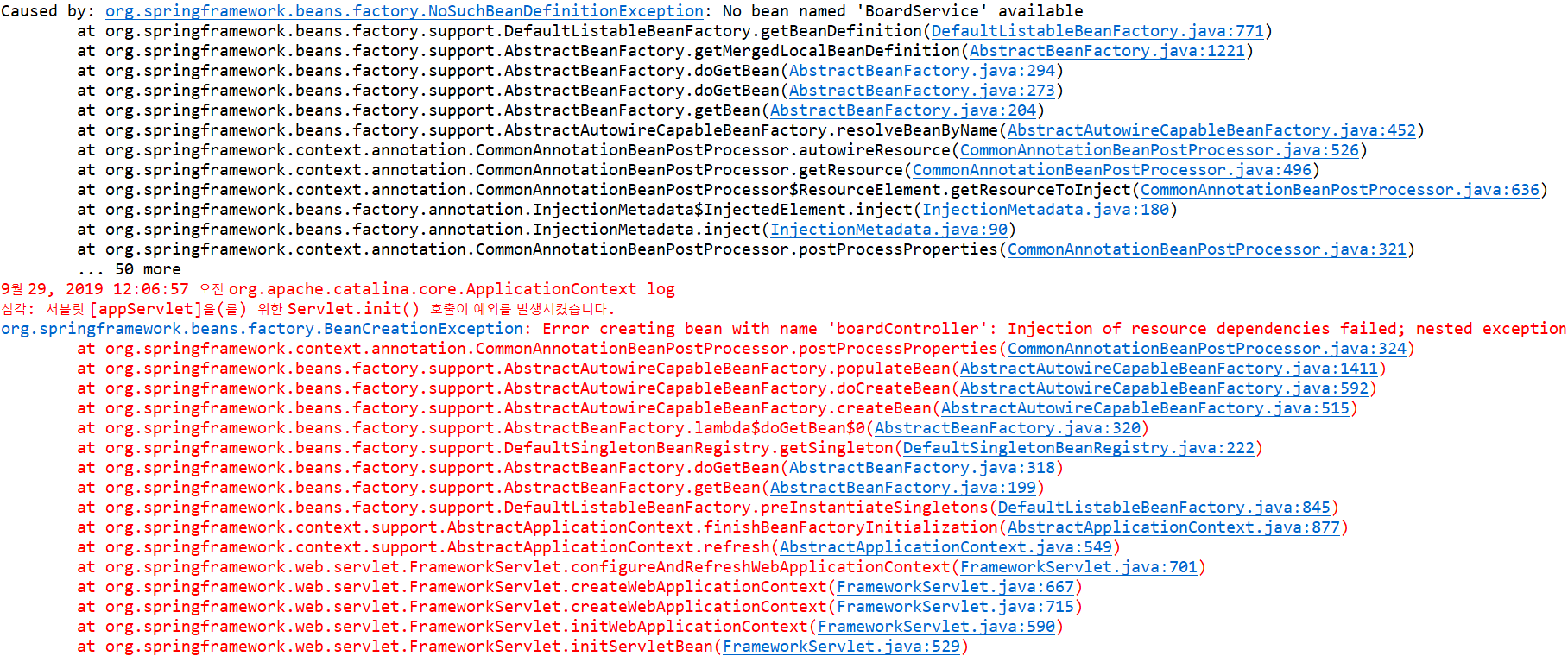 Injection of resource dependencies failed; No bean named 'BoardService' available 에러가 발생했다.