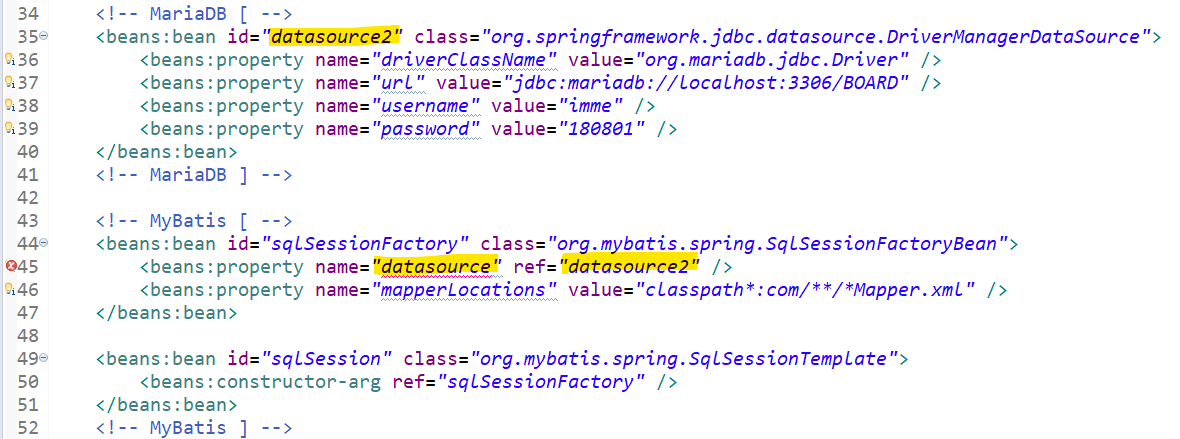 찾아본 결과 35번 라인 id 와 45번 라인 ref 는 사용자 정의값으로 동일하면 문제없고, name 은 반드시 dataSource 여야 한다.