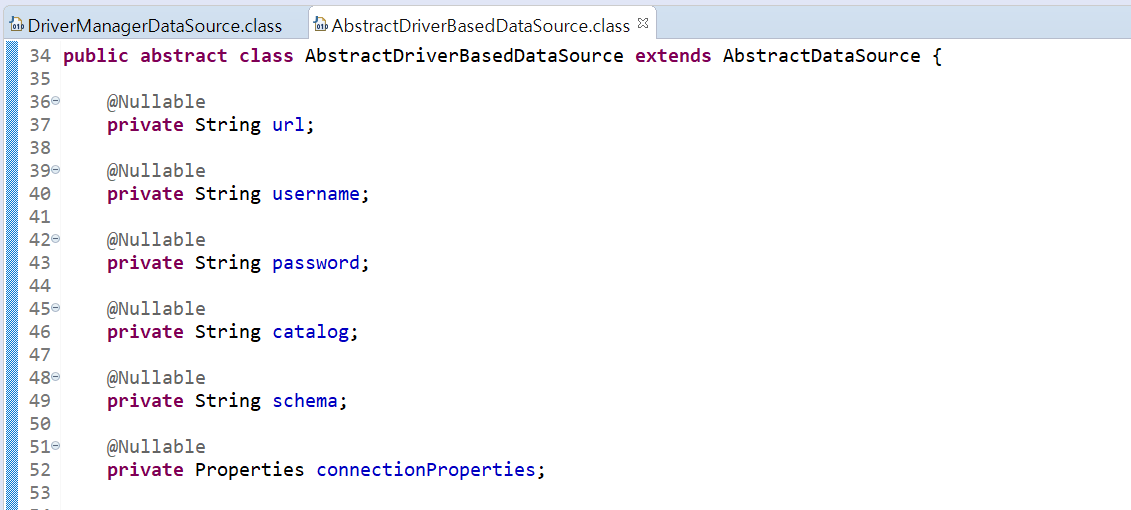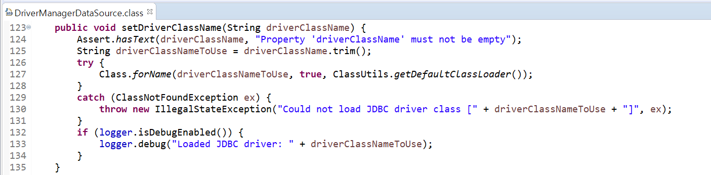 org.springframework.jdbc.datasource.DriverManagerDataSource 라이브러리 .class 를 열어보면 setDriverClassName 을 확인할 수 있다. driverClassName 으로 변수선언이 되어있다는 것.