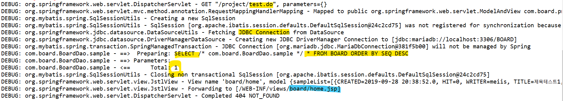 콘솔 로그를 보면 test.do 요청으로 JDBC Connection 이 되어 select 문이 실행된 것이 확인된다.