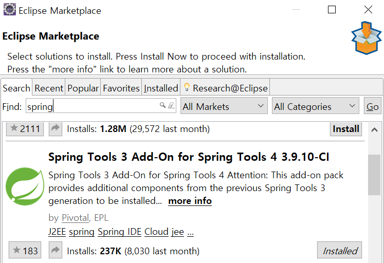Eclipse 메뉴에서 Help > Eclipse Marketplace > 'spring' 검색 > Spring Tools 3 Add-On for Spring Tools 4 3.9.1 을 install 클릭.