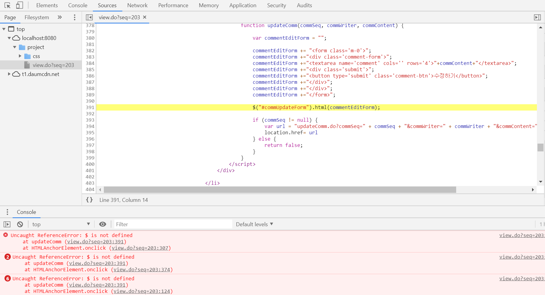 F12 로 확인해보니 $("#commUpdateForm").html(commentEditForm); 에서