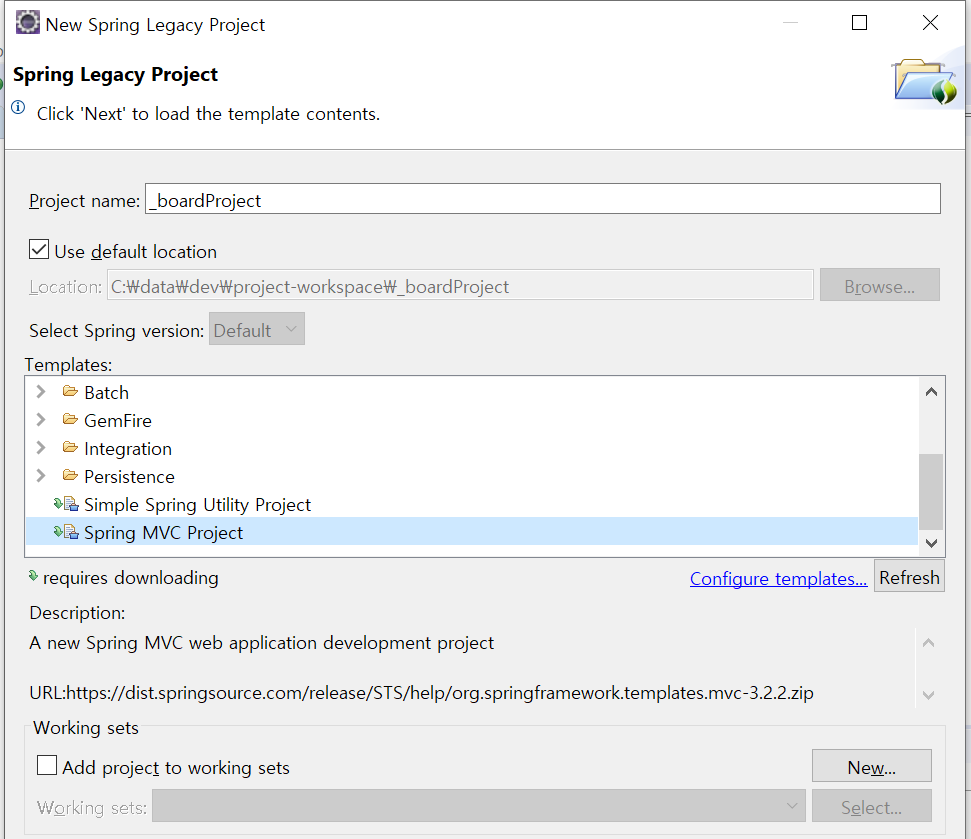 2. 템플릿에서 Spring MVC Project 선택 후 Next 클릭
