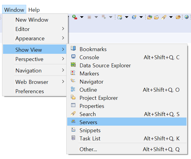 서버창이 닫혔을 경우 서버창은 Window - Show View - Servers 으로 켤 수 있다.