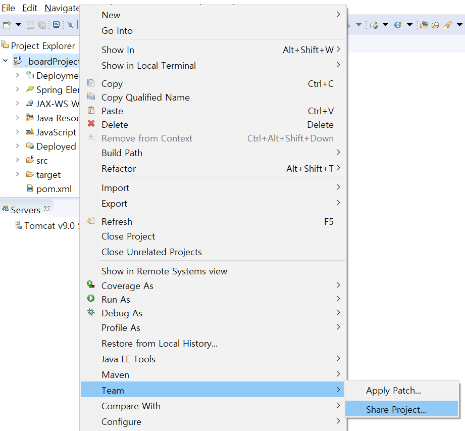 프로젝트 이름에서 마우스 오른쪽 클릭 > Team > Share Project