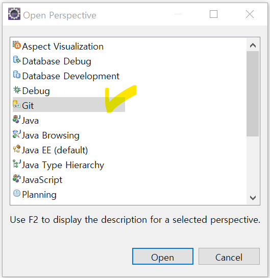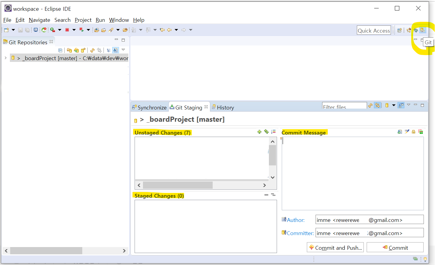 그 옆에 작게 보이는 git 퍼스펙티브 아이콘을 누르면 모드가 전환된다.