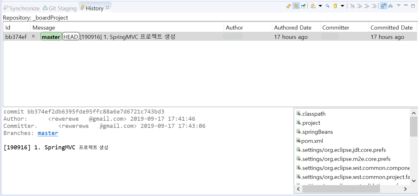 4) 왼쪽 프로젝트 익스플로러 창에서 보면 프로젝트명이 [_boardProject master] 로 바뀌었다.