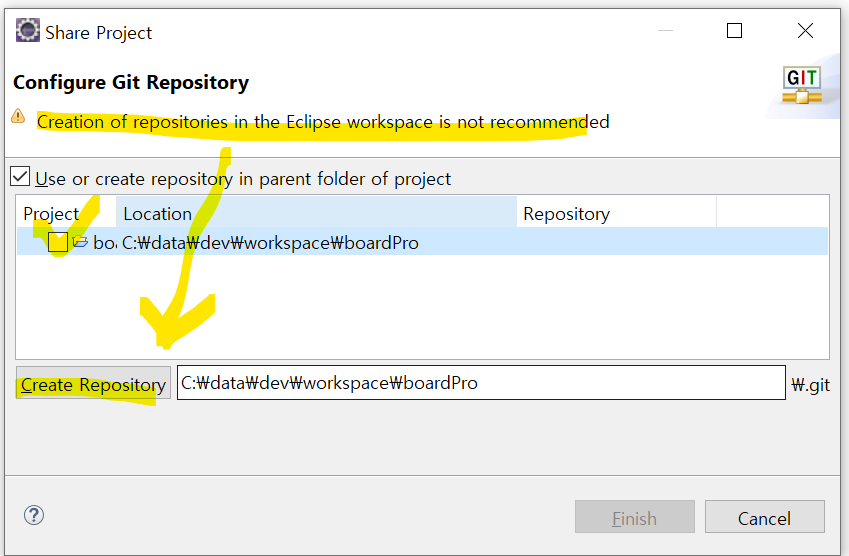 3) 'Eclipse workspace에 만들기를 추천하지 않는다' 는 경고문이 뜬다면 Create Repository 클릭