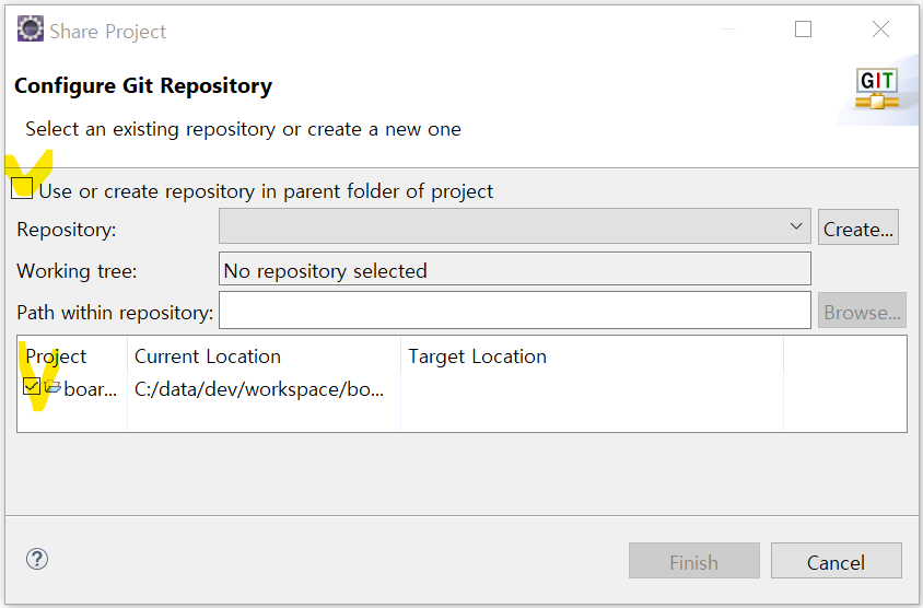 2) Use or create repository 체크 + 프로젝트명 앞 체크박스 체크