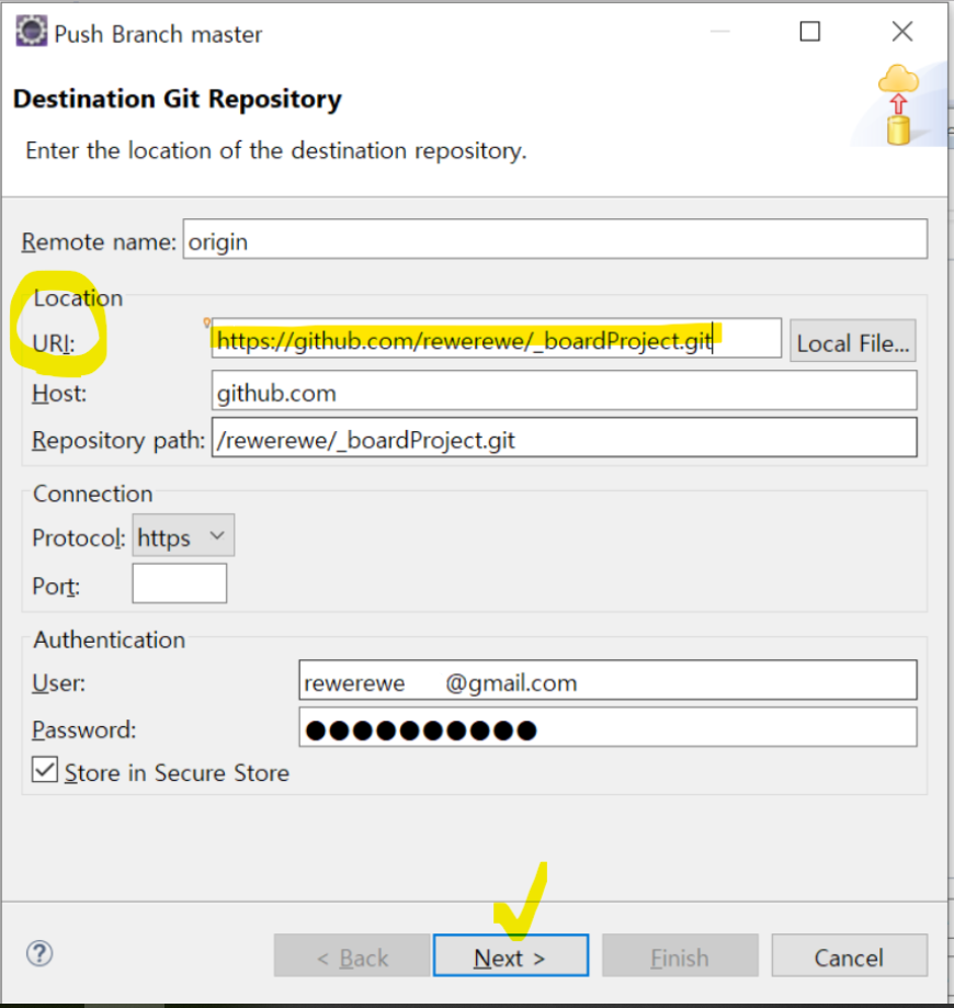 3. Eclipse 로 돌아와 github 원격 저장소 주소를 URI 에 붙여넣기