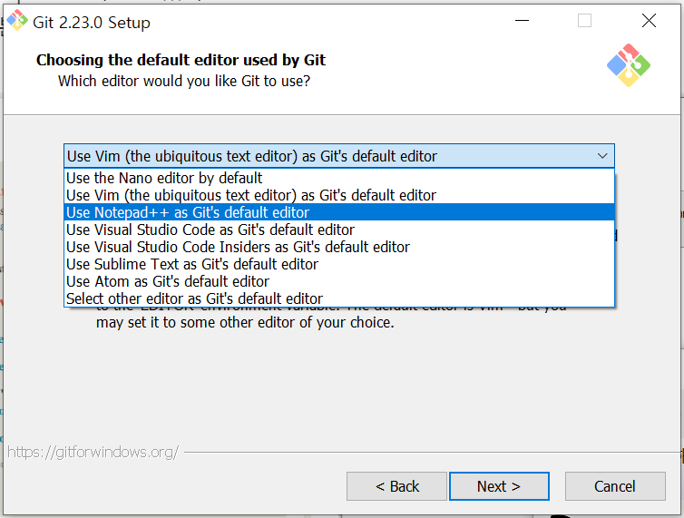 Select Components 는 기본설정 그대로 설치, 기본 editor 는 notepad++ 로 선택했다.