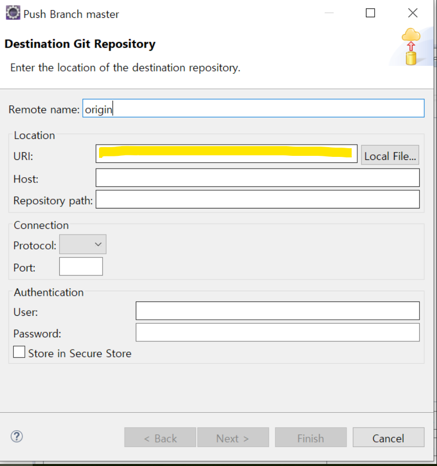 3. github 에서 생성한 원격 저장소 주소를 Eclipse Destination Git Repository 에 붙여넣기
