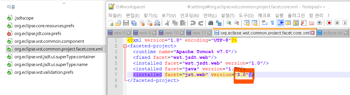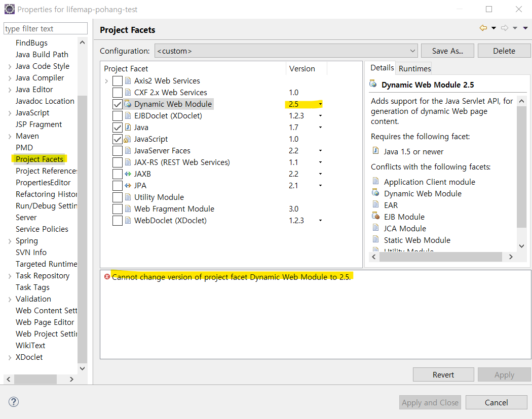 Propertise - Project Facets - Dynamic Web Module 에서 3.0 을 2.5 로 변경하려했으나 실패.