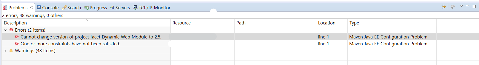 Maven 업데이트 후 Problems 에 2 error 가 발견되었다.