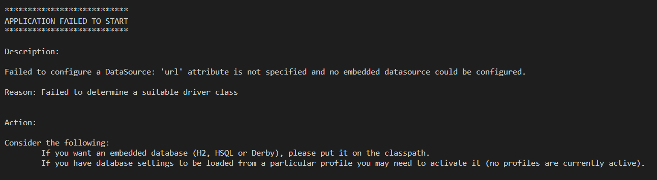 Failed to configure a DataSource: 'url' attribute is not specified and no embedded datasource could be configured.