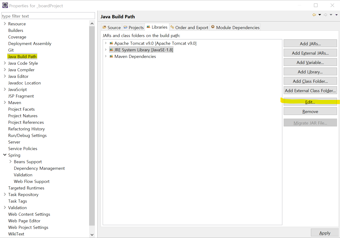 프로젝트에서 마우스 우클릭 > BuildPath > Configure Build Path > Click